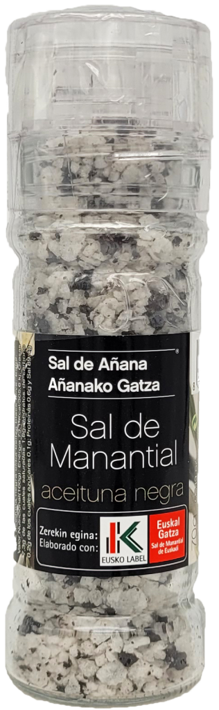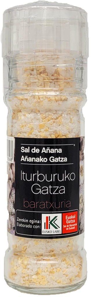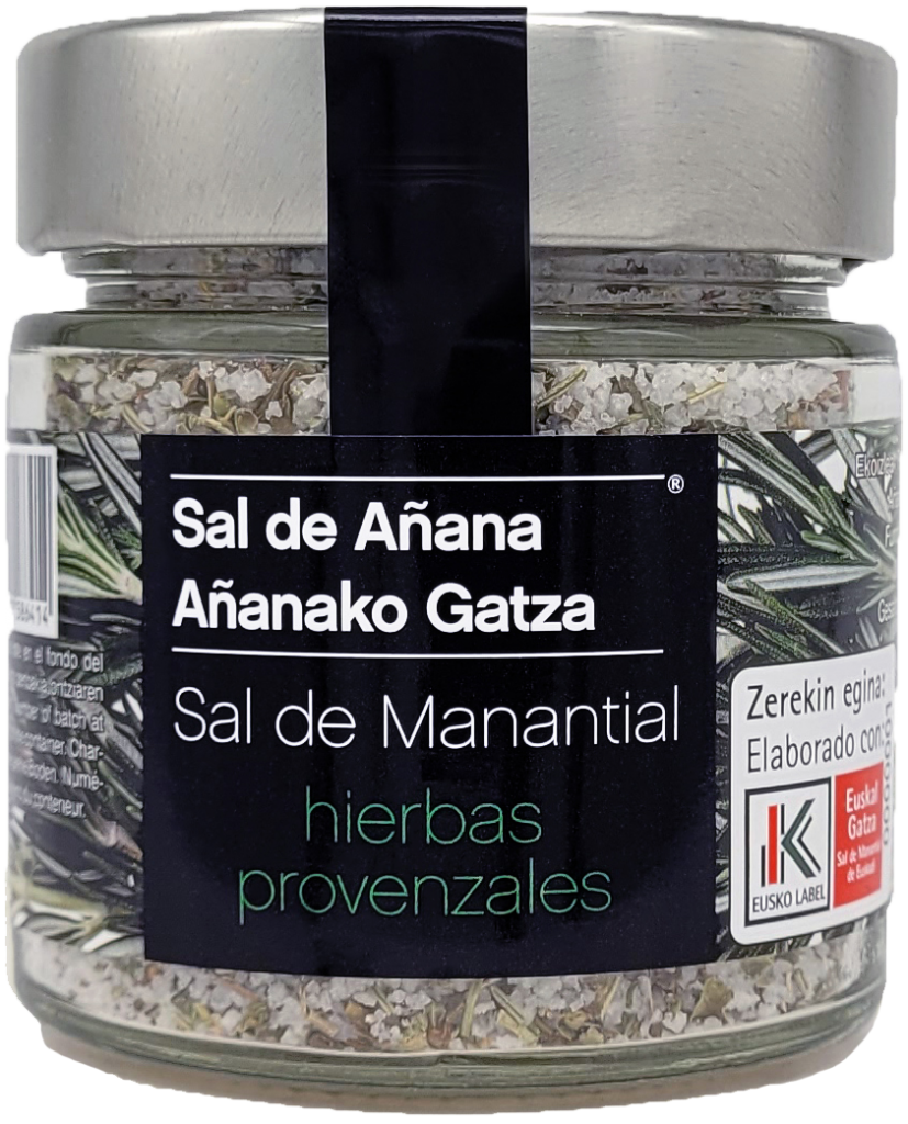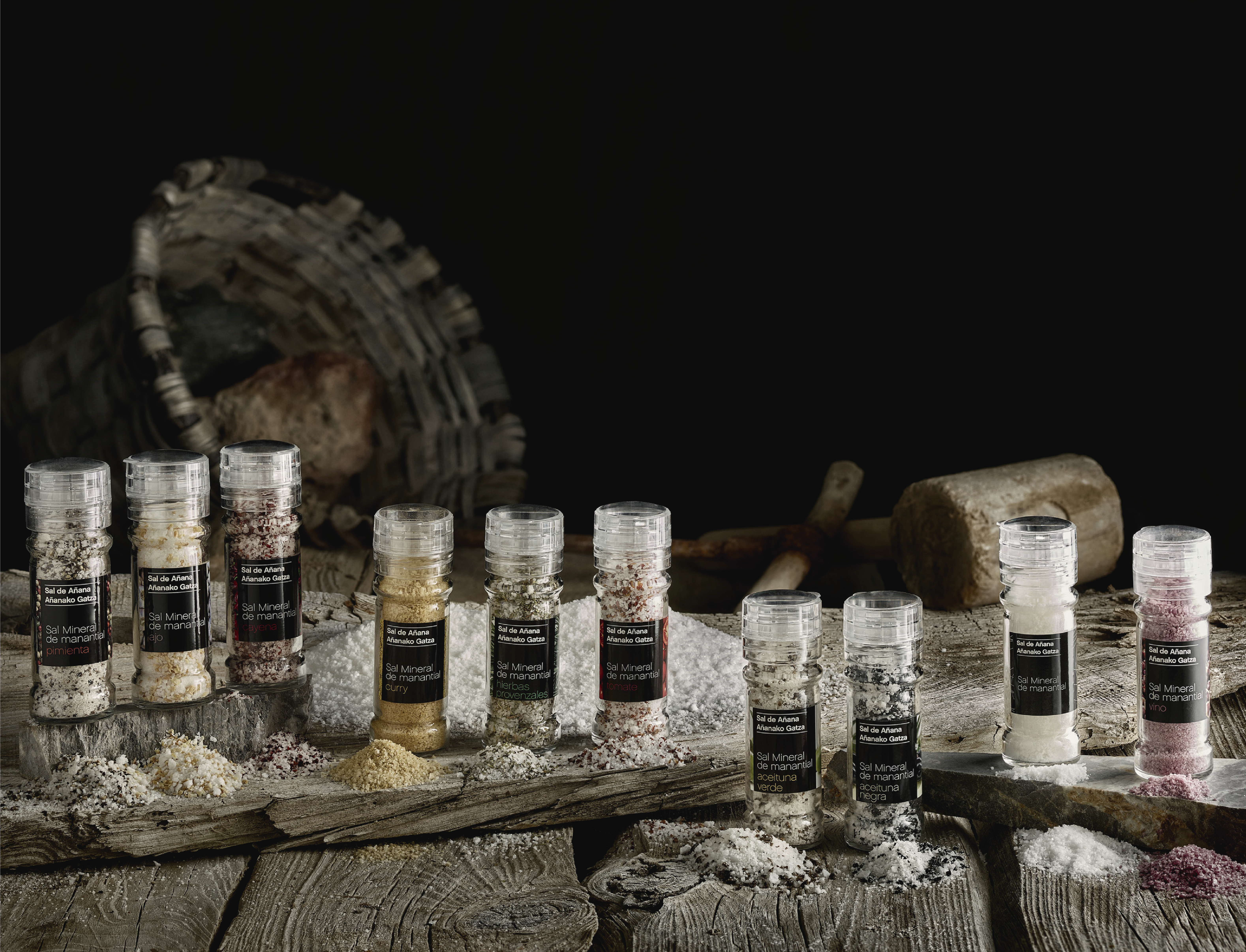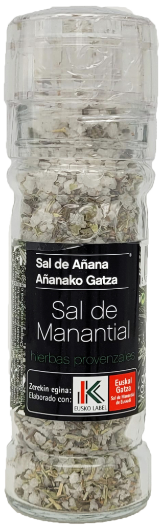 Sal de Manantial de Añana en combinación con una selección de sabores mediterráneos para acompañar a la maravilla mineral del Valle, en formato de molinillo o tarro de cristal o molinillo.